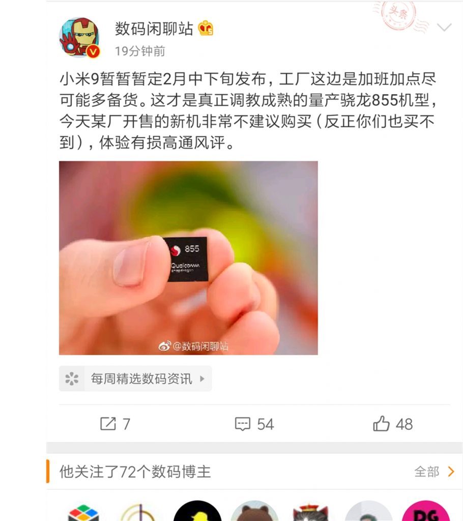 小米9将会搭载一块6.4英寸1080P的AMOLED屏幕,屏幕比例为19:9,手机正面仍然采用刘海屏的设计,不过刘海的面积会大大缩小。核心配置上,小米9将搭载高通骁龙855平台,同时将会推出10GB的内存版本。