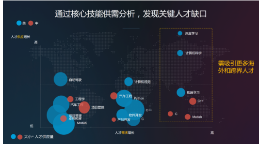 此外,领英还通过大数据分析了过去12个月中,中美人自动驾驶领域人才所拥有的相关技能的供需情况(图中横轴表示技能需求增长,纵轴表示技能供给增长)。从中可以看出,中国拥有核心技术的人才供应量不足,但对人才需求持续增长,特别是拥有核心技术的人才储备不够(没有显著对应技能的人才的增长),而美国拥有机器学习和深度学习技能的人才供给增长明显。