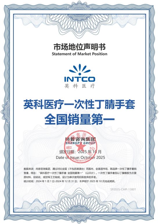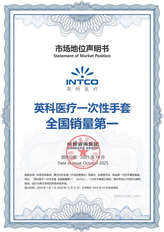 2025年10月,尚普咨询集团向英科医疗颁发市场地位声明书。此次英科医疗荣获尚普咨询【英科医疗 一次性手套全国销量第一】【英科医疗 一次性丁腈手套全国销量第一】市场地位声明,这一成绩不仅彰显了英科医疗在行业内的卓越地位,也为中国一次性手套市场的发展注入了强大动力。