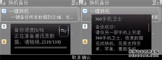 点击“一键转机”,。如果首次使用,需要先注册或登陆个人账号,360会自动打包备份通讯录、短信、隐私空间设置及私密短信、日程等个人配置,你要做的就是等待弹出“备份成功”提示框后点击“确认”。