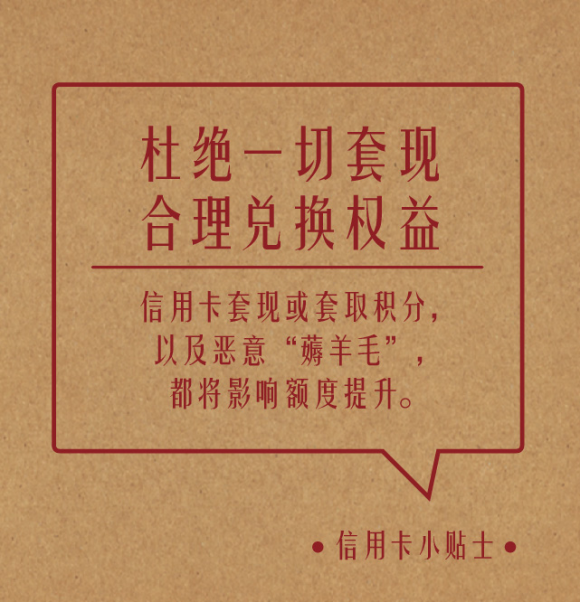 杜绝一切套现、套利行为,合理兑换信用卡权益。如果用信用卡套现或套取积分以及“职业羊毛党”恶意“薅羊毛”,不仅不能提升额度,反而有被降低固额的可能。