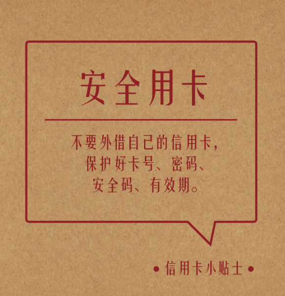 安全用卡。不要外借自己的信用卡,如果家人需要用卡,可以为其办理附属卡。要保护好信用卡卡号、密码、安全码、有效期等信息。其实,信用卡的有效期和安全码虽然印在卡面上,但这属于信用卡的交易验证信息,带有密码性质。在个别地方,只要输入信用卡的卡号、有效期和安全码,即可进行付款,并不需要输入密码。