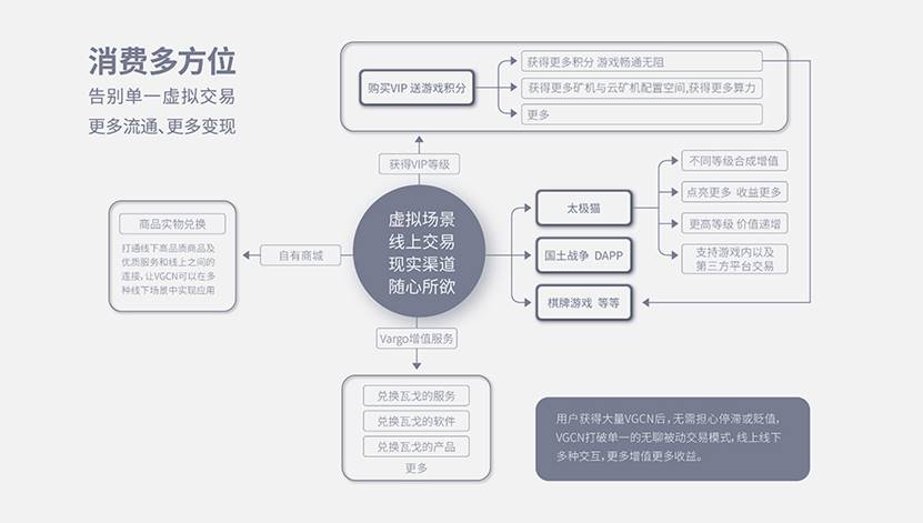 一,从通证的供给和流通机制来看,区块星球架构了区块链上运行的云生态体系,VGCN是基于此体系的流通货币,随时可验证、可追溯、可交换,安全可信可靠。用户通过购买主机、矿机、贡献流量、参与线上买卖、游戏、兑换等活动贡献营收,区块星球通过挖矿体系对生态参与者进行奖励,挖矿产生的VGO可以兑换为VGCN,VGCN通过兑换线上服务、线下场景消费来实现实际价值。从供给到流通,从挖矿到消费,区块星球每个环节的参与者的行为都随时在这个体系内进行验证,通证化的行为保证了每个节点的可信性和可靠性。