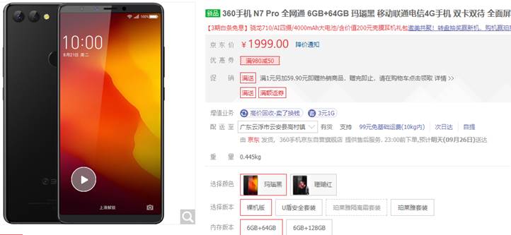 配置上,360手机N7 Pro采用了高通710处理器,有6+64GB、6+128GB两种内存版本可选,售价分别为1999元和2299元。近期入手,还可获得肤感手机壳、钢化膜和价值149元的360 DM2018 耳机等赠品,使得这款机型在原来售价亲民的基础,有了更高的明显的性价比,能够充分满足不同用户的需求。