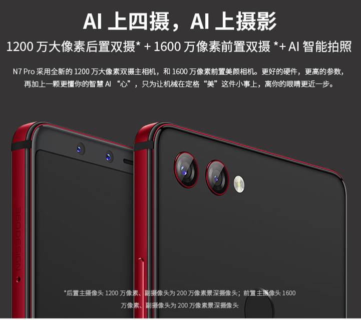 首次使用了前后四摄设计,其中后置1200万像素主摄像头,单个像素尺寸达到1.25um,光圈大小为f/1.8,副摄像头为200万像素专业景深摄像头。强大的硬件规格辅以AI智能深度学习算法、AI放模糊智能成片技术、AI智能曝光技术等功能,使得360手机N7 Pro的拍照性能可轻松媲美iPhone X。