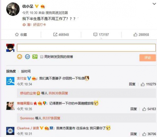 支付宝将于10月7日从转发微博的网友中,抽选1位集全球独宠于一身的中国锦鲤,在这条微博的评论区即可看到支付宝到底是如何“宠”这位天选之子的,众多品牌官微、旅游局都在评论中开启了送送送模式,当然也有不少蹭热度的广告,在这里就不给他们打广告了,想要体验“云中奖”的网友可以翻翻评论感受一番。