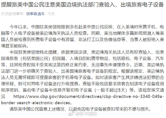 近日,有这样一个消息:“【中国领事服务网】本月18日公告指出,驻美中领馆接到多名中国公民反映,在入境美国时手机、电脑被海关检查,由于依据美国法律,美边境海关执法人员可在无搜索令的情况下,搜查旅客的手机等电子设备,如对该旅客产生其涉嫌违法犯罪的合理怀疑,更可对其电子设备进行升级搜查,领馆因此特别提醒入、出境美国的中国公民留意,以避免不便与损失。”这段新闻的意思无非在说:中国公民出入美国国境,你的手机要交出来,被美国海关工作人员翻阅、查看,每个中国人都得有这样的心理准备。