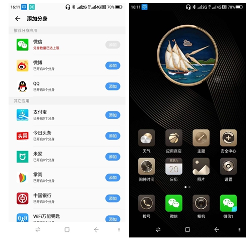 六、访客系统分身隐私设置完毕后,手机主人的隐私访问软件操作界面、与其他人用户可以访问的无隐私系统操作界面一分为二的清晰明了。比如下图所列的手机常用通信软件【微信】:那么“微信”即为其他用户可以访问的“无隐私”软件,而“微信1”则为带有手机主人“隐私信息”的私人访问软件。设置成功后,如果海关人员或其他陌生人拿到这种设置了访客功能的360手机后,只能查看到“微信”界面,而绝对看不到藏有隐私资料的“微信1”,只有手机主人通过自己的隐私访问密码后,才能访问类似“微信1”这样带有隐私信息的软件!这就是360手机【访客系统】为手机主人所带来的私隐信息安全性。