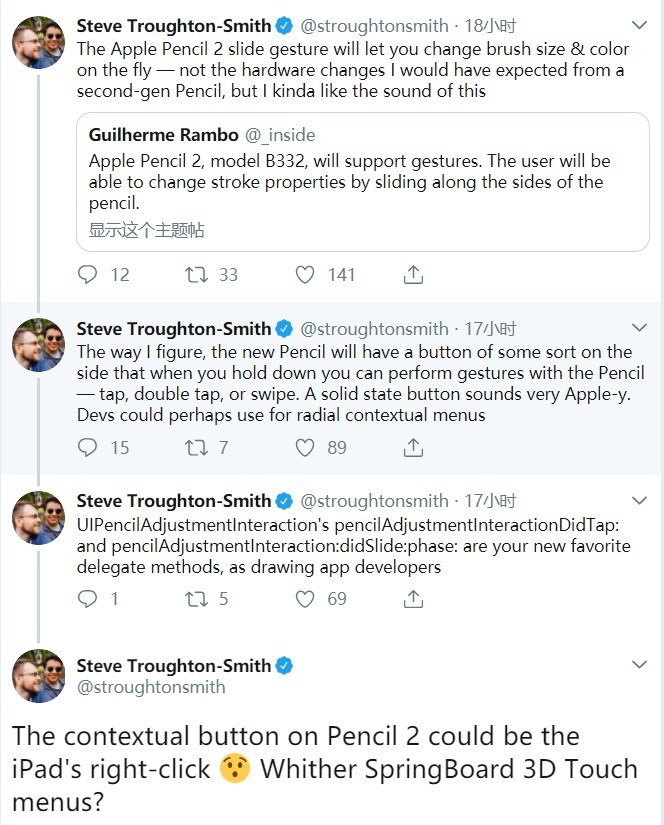根据国外开发者 Steve Troughton-Smith的爆料,苹果Apple Pencil 2将会搭载一枚按钮,从而实现点击/滑动的操作。