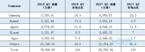 2018Q3全球智能机市场 三星仍领跑 但优势缩小