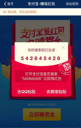 领取方法:打开支付宝APP,首页顶部搜索数字542845426,即可领取大红包,记得每天领取哦!(每天一次)