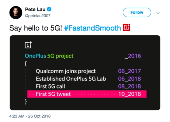 一加一直致力于为用户带来轻快流畅的使用体验,为了让用户优先享受5G通讯带来的便利,一加从2016年就开始在5G上投入。今年8月,一加在高通美国实验室成功联通了5G;10月,刘作虎发出了世界上第一条5G网络下的推特。正如刘作虎所说:“拥抱5G是由一加的使命和用户属性共同决定的,一加社区拥有来自196个国家超过500万的用户,其中大部分是科技狂热爱好者,他们愿意成为首批尝鲜新技术的人。两年前社区里就有用户开始关注和讨论 5G,这促使一加在5G上的不断进步。目前,一加正在与EE加紧开展5G手机研发方面的合作,共同为用户带来稳定与流畅的5G体验。”