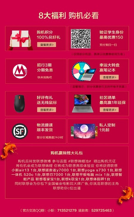 就算没能顺利化身联想锦鲤,这次寒促联想还有其他丰富的福利等你来领取,像下面这个官网的八大购机福利,就能让想要入手新电脑的你拿到手软: