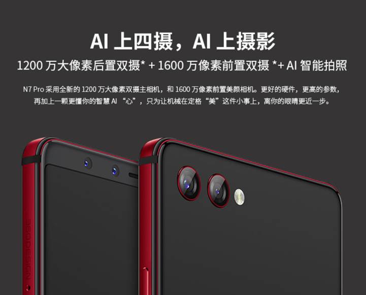 360手机N7 Pro配备了1200万像素+200万像素的摄像头搭配。主相机的单个像素尺寸超大配合上超大光圈,室内和暗光环境下拍照更加清晰;后置副摄像头为一颗 200 万像素的专业级景深摄像头,两颗摄像头协同拍摄,能够真实地记录 被摄物与前景和背景的距离信息,为AI 算法提供更好的前期素材。前置摄像头方面,360手机N7 Pro采用了1600万像素的超高像素感光元件,配合大光圈保证了自拍和视频聊天中纯净清晰的图像效果;前置副摄像头采用一颗200万像素的专业景深相机,使得360手机N7 Pro能拍出更加逼真的虚化美颜照片。
