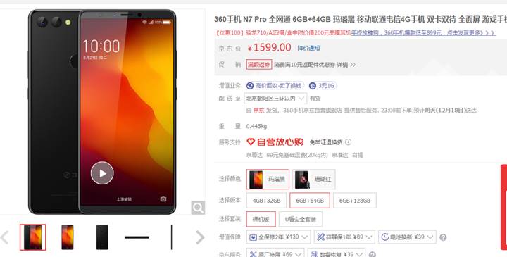 360手机N7 Pro配置的是18:9 比例的5.99 英寸无刘海全面屏,整体升级比较简洁大方,背屏采用的是2.5D的玻璃背板,黑色背板与红色中框相对应不仅颜值高,而且手感和握感都非常好。