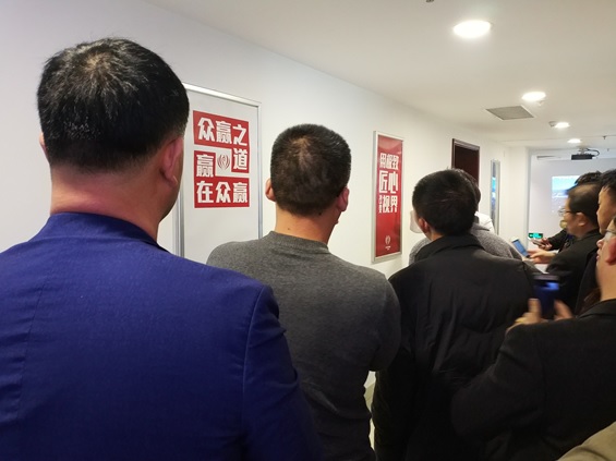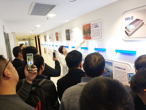 会议开始前,数十位微投事业伙伴参观了众赢时代公司。经过公司文化墙时,大家仿佛穿梭了一条微投时光隧道。从2014年风靡一时的We8,到2018年的巅峰之作VM4,短短5年光景,众赢时代树立起了坚固的技术壁垒,成为了投影手机行业的绝对领导者。