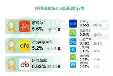 摩拜单车行业领先地位的确立在极光数据中也得到证实,报告显示摩拜单车以渗透率5.6%,环比上升14.2%,保持高增长,ofo共享单车渗透率为5.2%。DAU方面,摩拜单车在8月份超越ofo共享单车跃居第一,9月DAU超500万。