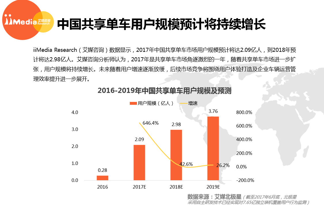 2017年以来,共享单车企业加快融资和市场扩张步伐,共享单车行业呈现爆炸式增长,市场竞争进入白热化状态。最近,全球领先的第三方权威互联网数据机构iiMedia Research(艾媒咨询)最新发布了《2017年夏季中国共享单车市场研究报告》。iiMedia Research(艾媒咨询)数据显示,2017年中国共享单车用户规模将迎来爆发式增长,年底用户总量预计将增长至2.09亿,增速将达646.4%,到2018年将达2.98亿人。