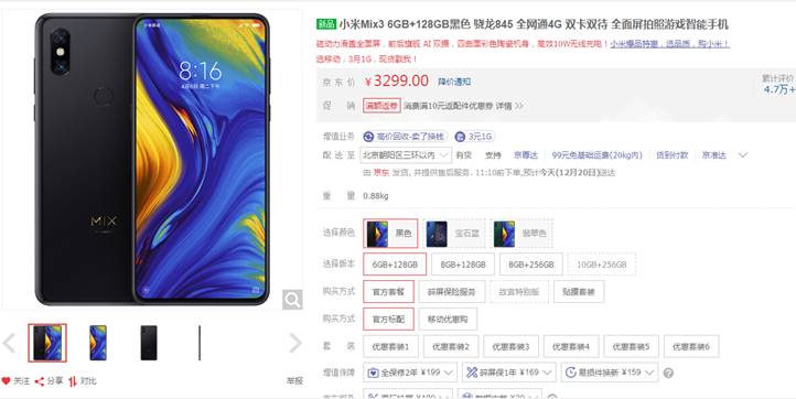 小米MIX3上搭载高通骁龙845处理器,作GPU方面采用了最新的Adreno 630。续航上,小米MIX3配置了3200mAh的电池,采用高通QC4.0快充方案,最高18W的充电功率。有了超强的硬件支持,玩高帧手游也没在怕的。小米MIX3搭载的是基于安卓9.0深度定制的MIUI 10。针对全面屏进行了一些细节的调整,同时结合更智能的AI引擎,小爱同学智能语音系统也得到了优化,能够识别多种方言。不要太方便哟!目前京东售价3299元。