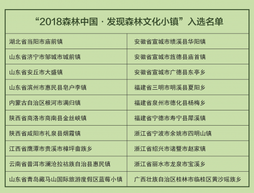 2016~2017年,森林中国在全国共遴选了30个“森林文化小镇”,这些小镇生态文化保存完好,森林覆盖率高,具有较强的绿色可持续发展优势。2018年“发现森林文化小镇”的遴选工作从7月份开始申报,经形式审查、专家初审和专家委员会评议投票,最终从全国42个申报单位中遴选出20个小镇入选“森林中国·森林文化小镇“,名单如下(排名不分先后):