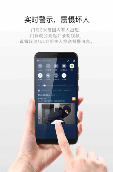 对于想要在各个小区“踩点”的不法分子,360可视门铃还有访客身份识别功能,该技术基于360人工智能研究院自研的AI人脸识别,经过数亿次人脸数据训练,人脸识别率高达99%,只要在门口露脸的人,都可以识别出他/她的身份。如果有可疑人员在门口逗留,360可视门铃便自动录制视频并直接推送到用户手机,接着便会发出闪烁灯,警示不法人员,绝不给他们任何可乘之机。