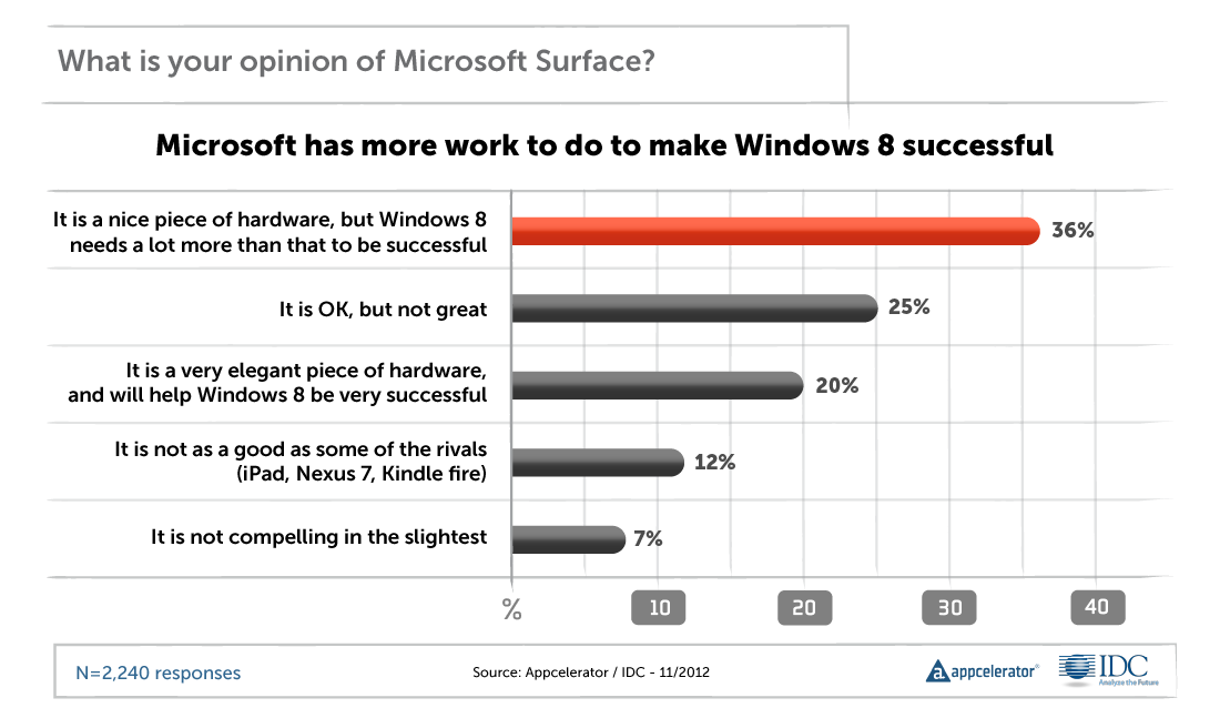 微软如果想要Windows 8获得成功,仍需付出很大努力。有36%的开发者认为Surface是一个不错的硬件产品,但是Windows 8还需要做的更多,才能获得成功。