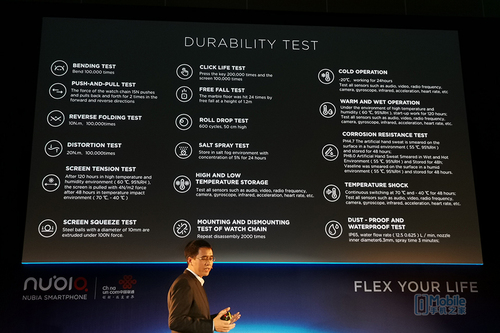 有别于传统屏幕,努比亚α采用的柔性OLED屏幕结构多达11层,在弯折的过程中其粘合可靠性、透光性等都是难点。最终实现8毫米的最小弯曲半径,尤其是厚度仅0.64毫米的同时,拥有10万次以上的弯折及扭曲寿命,具备优秀的硬度和抗冲击等防护性能。