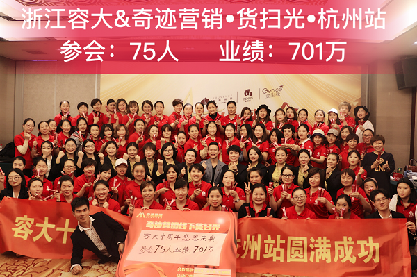浙江容大携手奇迹营销杭州站货扫光会议,参会人数75人,业绩达到701万;