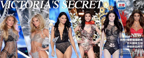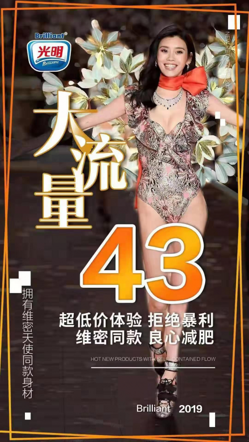 我们产品的包装上都会有我们的光明的英文logo,套盒上会有我们的维密超模。