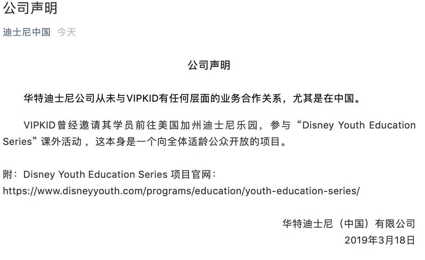 3月18日,迪士尼中国官方微信公众号发布声明称,从未与VIPKID有任何层面的业务合作关系,尤其是在中国。VIPKID曾经邀请其学员前往美国加州迪士尼乐园,参与 “Disney Youth Education Series” 课外活动 ,这本身是一个向全体适龄公众开放的项目。