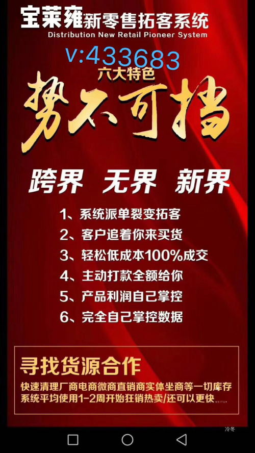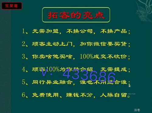 拓客它是一个非常神奇的卖货工具,它可以颠覆传统行业的卖货方式,它可以做到让陌生的客户主动加你的微信,主动给你转款,主动买你的产品,而且是100%的成交,那对你的好处呢,让你不脉。