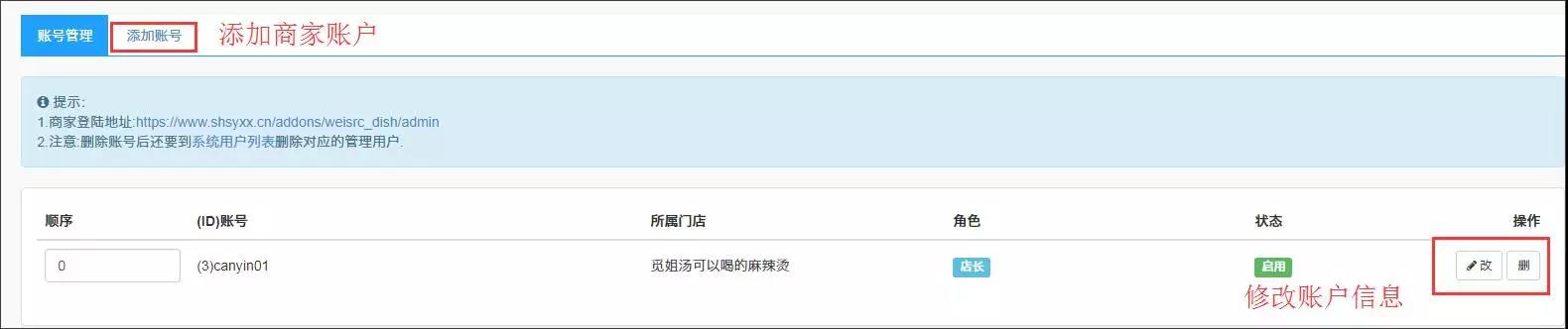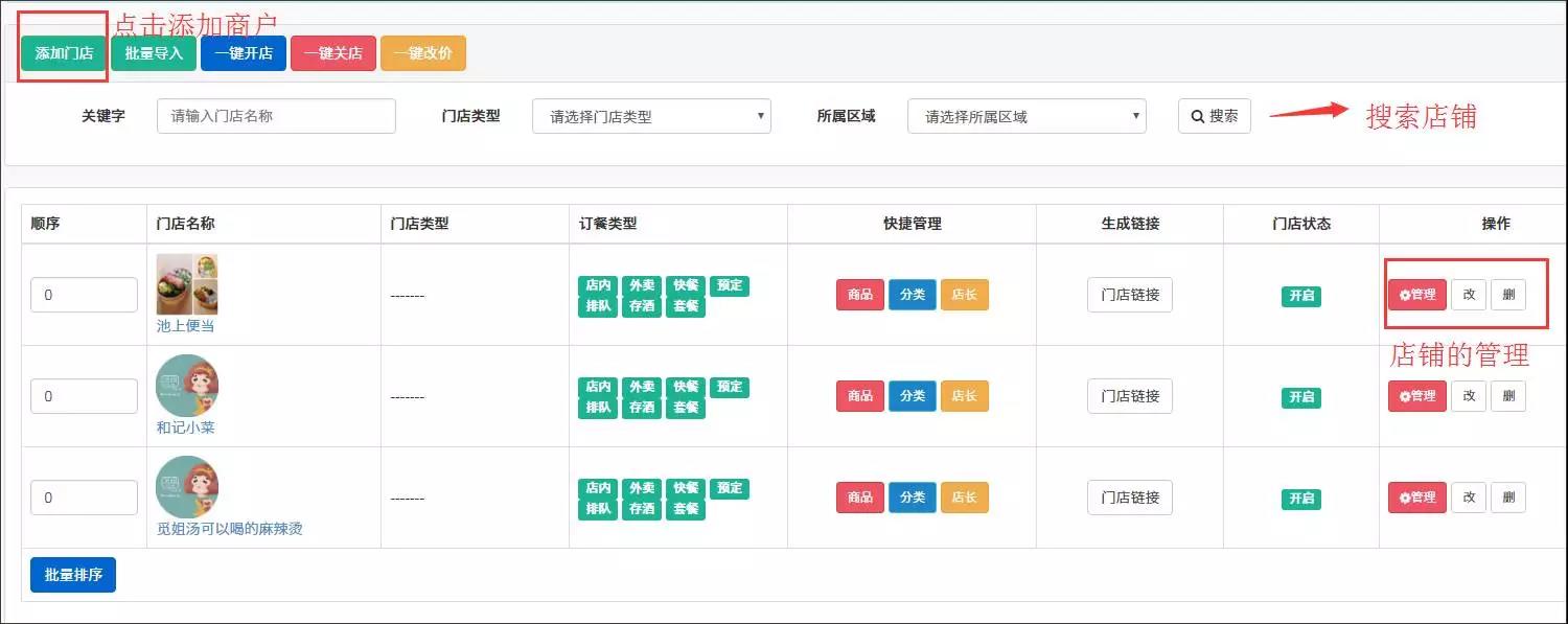 平台支持查看/添加/编辑门店,修改门店信息包括(店名,状态,logo,公告,简介,类型,商家电话,以及商家坐标)