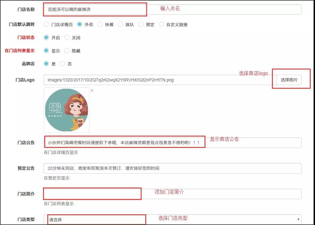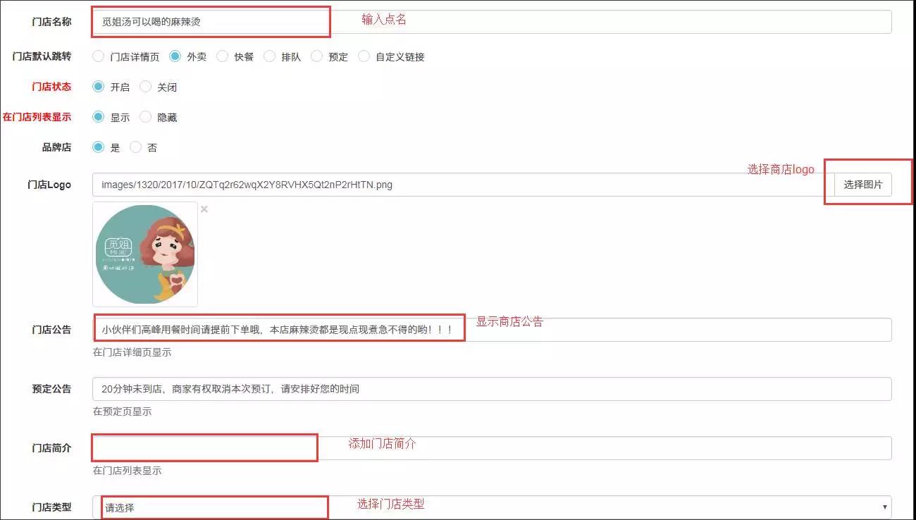 系统支持入驻门店自行定义自己门店的名称、状态、logo、公告、类型、配送价格、配送时间等信息。