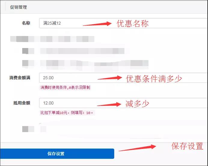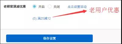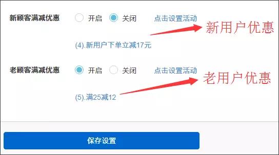 系统支持设置新/老用户优惠开启/关闭,支持添加满减优惠。
