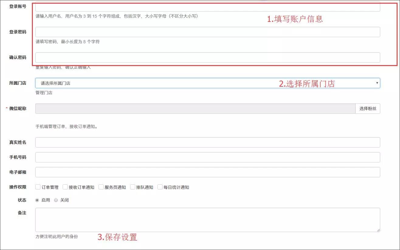 平台支持添加/编辑用户账户信息,设置账户登录账号密码、所属门店、操作权限等信息。