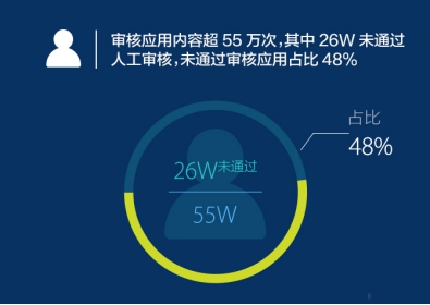 报告显示,2017年,OPPO软件商店共审核应用资质约20W次,其中约10W次未通过资质审核,未通过约50%。共审核应用内容55W次,其中26W次未通过人工审核,未通过占比近48%。