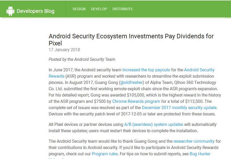 为了奖励此次360 Alpha团队为保护手机用户安全做出的贡献,谷歌向360 Alpha团队负责人龚广颁发了总额为112500美金的奖励(包括105000的Android奖励和7500的Chrome奖励),这是自2015年谷歌设立安卓漏洞奖励计划(ASR)三年来给出的史上最高奖励。