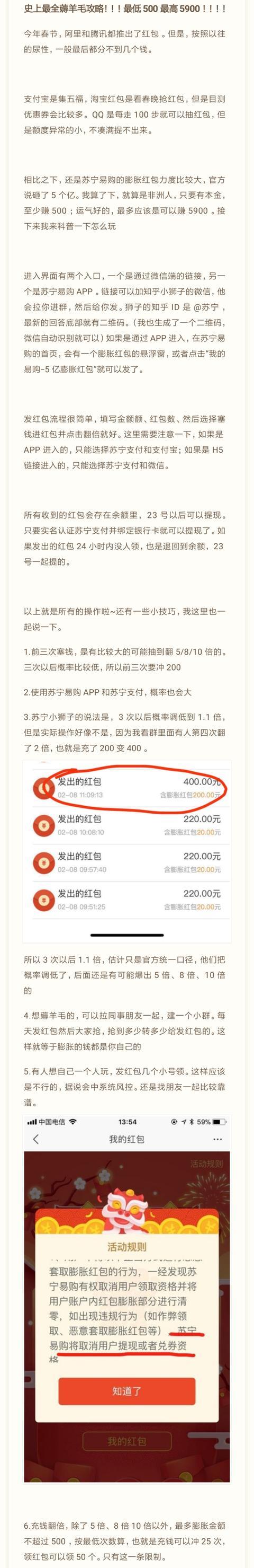 另外,笔者搜索网络发现,一份号称苏宁膨胀红包“史上最全薅羊毛攻略”的图片也在迅速在网上流传。