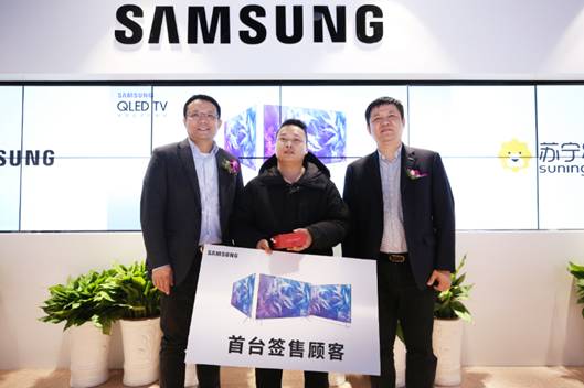 三星、苏宁高层领导为首位网络预约成功的幸运顾客颁发证书、奖品