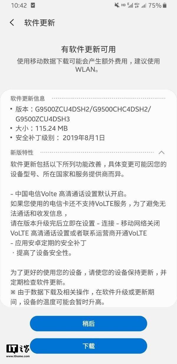 IT之家9月2日消息 根据网友反馈,三星S8系列国行手机开始推送新的补丁更新,其中包含了对中国电信VoLTE高清通话设置支持,并且默认开启该功能。另外更新了安全补丁,提升了设备的安全性。