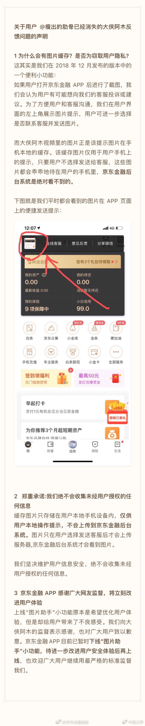 昨天下午,京东金融就这一问题,再次向中国之声发来文字说明,其中承认,这一APP在截图反馈功能开发上存在技术问题。具体为用户将京东金融App切换到后台后,该功能继续运行,继续接收新增图片通知(包括截屏和照片等)并在手机本地缓存,而原功能设计需求是切换后自动停止该功能,属于需求错误开发。同时,经过安全技术团队深度评估,该功能也不应该使用手机缓存技术来实现,应该直接使用手机实时内存(RAM)实现并增强提醒,无需使用手机本地缓存,当京东金融App切换或退出时,将自动清空。