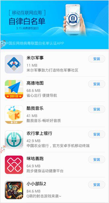 "白名单"是"移动互联网应用自律白名单"的简称,是2013年由中国反网络病毒联盟发起的自律性行业免费认证,对移动APP开发者进行可信认证。"白名单"有着严格的检测认证机制,申请企业开发的所有APP必须得到包括"奇虎、腾讯、金山、瑞星、趋势、网秦、安天、安管佳、恒安"等11家国内主流移动安全企业的一致认可,才有资格进入"白名单"。
