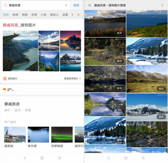值得一提的是,在全局搜索中输入不含图片字样却包含用户潜在搜图意图的关键词时,系统也能呈现搜狗图片搜索的优质结果。如秋冬季节是去挪威、芬兰、冰岛等北欧国家追极光的黄金时段,驴友们在做旅行攻略过程中需要浏览大量的实景图做参考。想知道挪威的景色如何,直接在全局搜索中输入“挪威风景”,搜狗图片搜索在搜索结果页第一条即为驴友们提供了大量与挪威相关的高清风景图,其中还包含版权机构的原创正版图片,并以“版权”字样清晰标示,可更好地满足用户对这些优质图片的欣赏、使用需求。