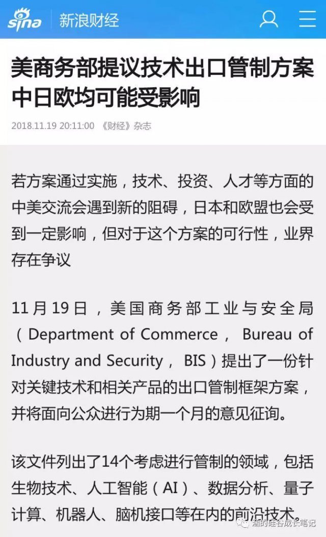 11 月 19 日,美国商务部工业安全局发布了一项,针对 " 关键 " 技术出口限制的最新草案,正在征询意见。其中,人工智能技术赫然在列。