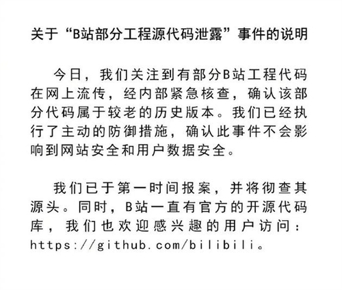 B站回应:泄露代码属较老历史版本 已报案彻查源头
