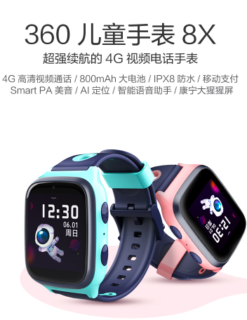 360儿童手表8X依托于360集团强大的研发优势和多年的用户口碑积累,坚守儿童安全教育初心,搭配更多的实用功能。其拥有高清视频通话、800mAh大容量电池、IPX8超高级别防水能力、移动支付和零花钱管理能力,还有AI定位和智能语音助手相加持,多样功能共同助力孩子健康成长。
