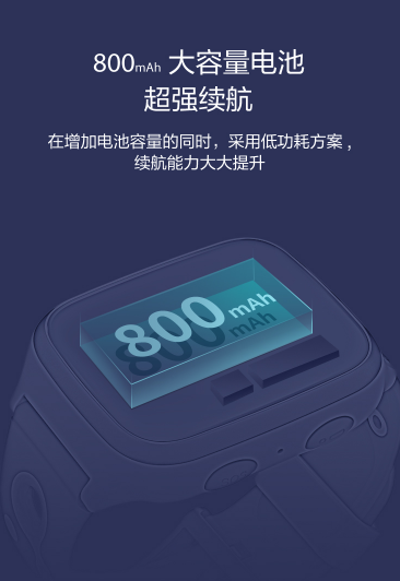 与上一代360儿童手表7X相比,8X的机身厚度缩小了很多,并且其表盘厚度仅为14.25毫米,更令人惊喜的便是其内置的800mAh大容量电池,在配合360儿童手表的低功耗方案后,这款儿童手表的续航能力得到大幅度提升,在正常使用的情况下,可以提供长达一周的续航服务,免去了频繁充电的烦恼,给孩子长时间的贴心保护。