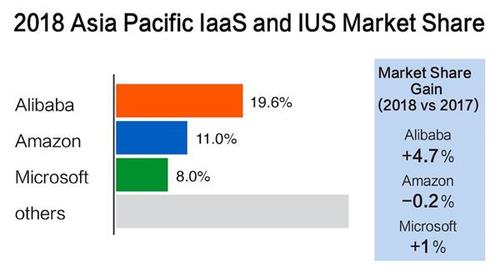报道引述研究机构Gartner的最新市场调研数据,在云计算基础设施领域,2018年阿里云在亚太区域市场份额为19.6%,同期亚马逊为11%、微软为8%。同比2017年,阿里云市场份额增长了4.7个百分点。同时,在全球范围内,阿里云持续保持全球前三的领先地位。