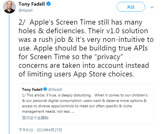 不过开发者们似乎不认同苹果这样“打官腔”的声明,新浪科技报道,在苹果声明发出后的几天,少数家长控制应用程序(包括 Qustodio、Kidslox、OurPact 和 Mobicip)背后的开发人员又以公开信的形式,回应了苹果打官腔的新闻稿 —— 呼吁该公司向第三方开发者提供屏幕时间 API 。Qustodio 联合创始人 Eduardo Cru 表示:若苹果真的相当在意安全问题,那为何不向竞争产品开放自己的屏幕时间 API,从而然市场环境立即变得更加安全和开放? 苹果前高管托尼⋅法德尔(Tony Fadell)也称公司确实应该向开发者开放屏幕时间 API 。