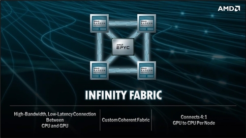 据悉, 每个节点上CPU和GPU的通信为定制化的Infinity Fabric互联技术,可达到高带宽、低时延。